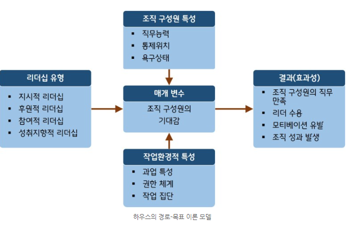 하우스는 리더십 스타일이 구성원의 기대감에 영향을 미칠 때 1) 구성원의 특성과 2) 과업환경요인이 조절변수로서 영향을 미친다고 하였다. 그 내용은 다음과 같다.