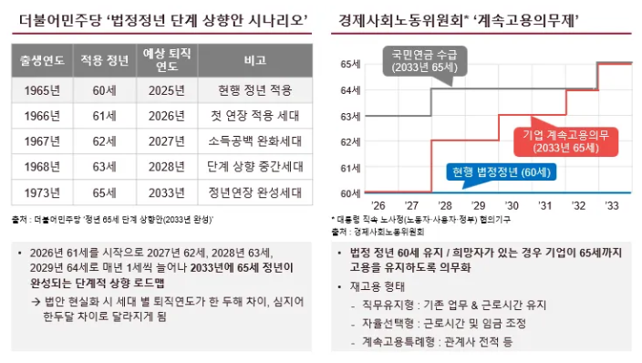 | 정년 65세 연장 | 입법 추진 | 제도 공백기 | 단계적 정착 | 연공급 유지 시 비용 리스크 증가 |